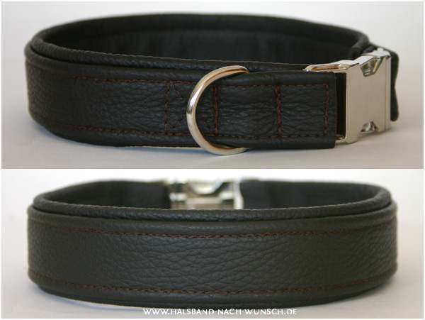 1. Halsband mit doppelter Lederfütterung in dunkelbraun. Edle Optik, nicht nur durch den Steckschließer aus Metall, passend zu fast jeder Fellfarbe. Für Halsumfang 44 cm.